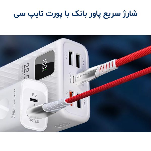 شارژ باتری پاور بانک کانفلون 30000mAh توسط دو درگاه MicroUSB و Type-c انجام میگیرد. برای شارژ سریعتر با توان ۲۰ وات می بایست از ورودی تایپ سی استفاده کرد.