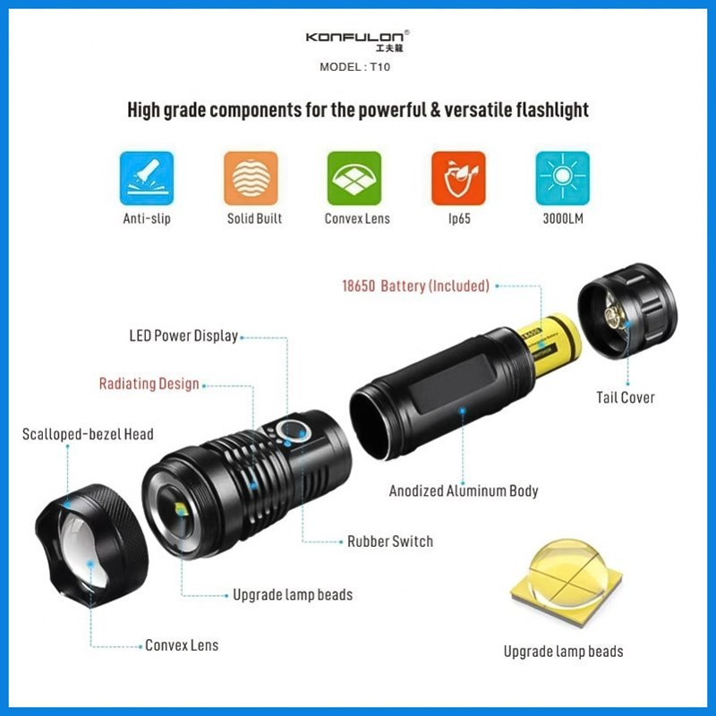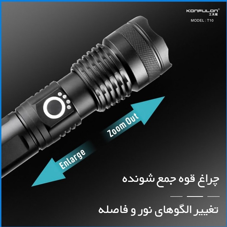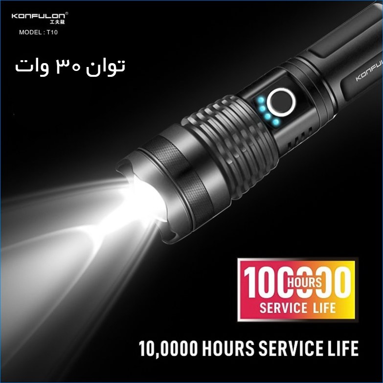اگر بهدنبال هیجان نیستید این محصول بهکار شما نخواهد آمد. این یک چراغ قوه معمولی نیست. برند کانفلون تمام توان خود را برای تولید یک چراغ قوه آلومینیومی ضدانفجار بهکار گرفته است. مدل T10 دارای باتری قابل شارژ 2200 میلیآمپری و قابل تعویض میباشد. طول عمر چراغ قوه 100000 ساعت میباشد، بهعبارتی حدود 11 سال و نیم، که این فوق العاده است. نور وحشتناک 3000 لومن و توان 30 واتی آن میتواند در تاریکی مطلق تا 500 متر پرتاب شود. این بدان معناست که اگر فردی در فاصله نیم کیلومتری شما باشد متوجه علامت شما خواهد شد. جلو پایتان را حدود 30 متر و به شعاع 20 متر کامل روشن میکند. سه حالت تنظیم نور زیاد، متوسط و کم دارد و دو حالت پلیسی و اضطراری خطر. به لطف وجود تکنولوژی ضدآب استاندارد IPX5 براحتی در زیر شدیدترین باران هم قابل استفاده است. بند مچی جداشونده حتما بهکارتان خواهد آمد. گردنی تلسکوپی با قابلیت تنظیم نور متمرکز نقطه ای و پخش نور زیاد از ویژگی مهم این چراغ قوه از برند کانفلون است. شارژ چراغ قوه از طریق درگاه تایپ سی و بسیار سریع انجام میگیرد. اگر بخواهیم از ویژگیهای این گجت حرف بزنیم میشود چندین صفحه توضیح داد. بههرحال برای تمام رانندهها، طبیعت گردها، مشاغل خاص همانند آتش نشانها، نظامیها و غیره یک وسیله ضروری و کاربردیست. اگر بدنبال یک چراغ قوه درست و حسابی با برند معتبر هستین حتما مدل T10 از برند کانفلون را مدنظر داشته باشید.
