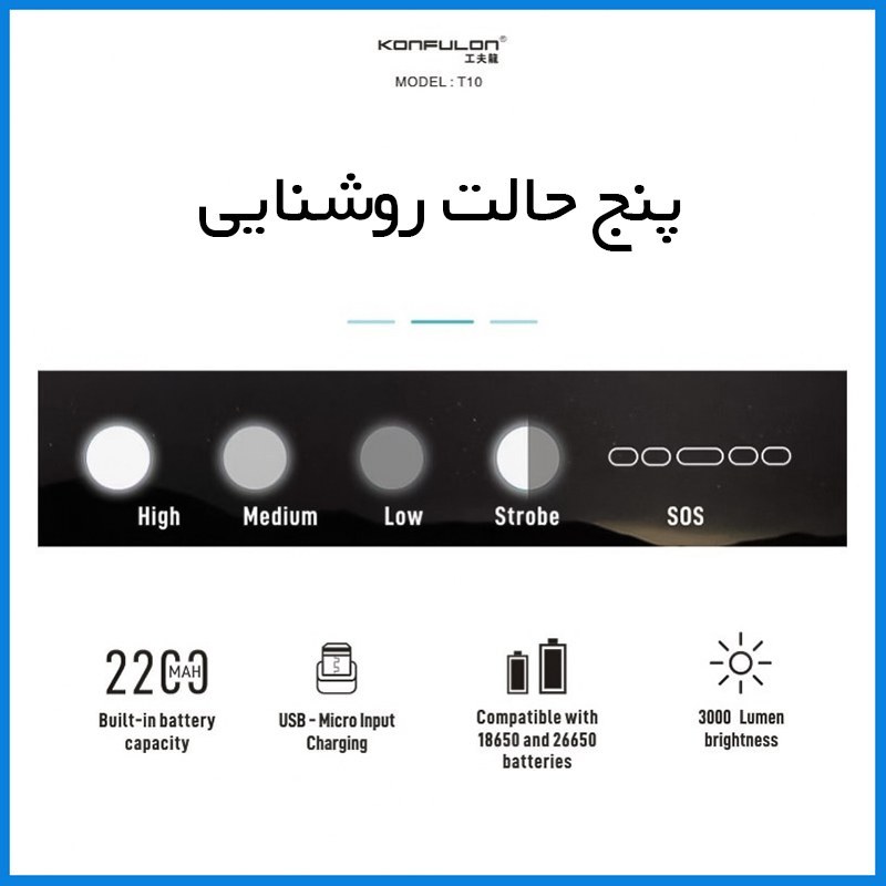 سایر توضیحات: برند معتبر کانفلون – بدنه آلومینیومی محکم و مقاوم – دارای زوم قابل تنظیم – دارای ۵ حالت نوردهی – دارای حالت اضطراری SOS – توان ۳۰ وات – دارای استاندارد ضد آب IPX۵ – فاصله روشنایی ۳ الی ۵۰۰ متر – میزان روشنایی ۳۰۰۰ لومن – باطری های قابل شارژ با ظرفیت ۲۲۰۰ میلی آمپر ساعت – دارای بند آویز مچی